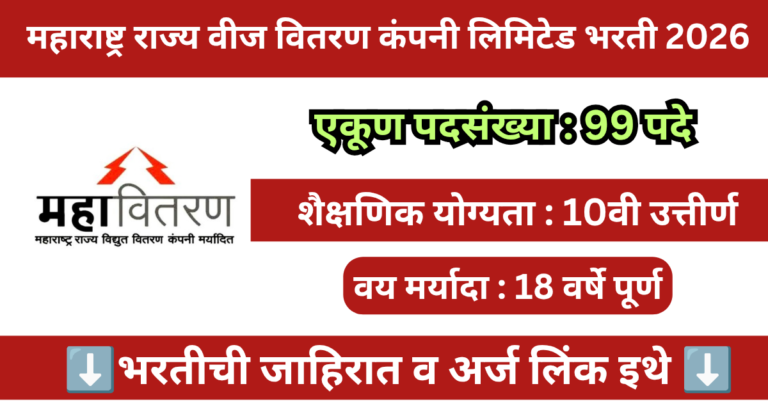 Read moreमहाराष्ट्र राज्य वीज वितरण कंपनी लिमिटेड मध्ये 99 पदांसाठी भरती 2026 | Mahavitaran Baramati Bharti 2026