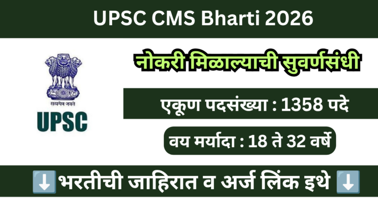 Read more[1358 जागा] मार्फत संयुक्त वैद्यकीय सेवा परीक्षा 2026 | UPSC CMS Bharti 2026