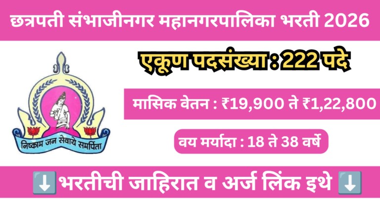 Read moreछत्रपती संभाजीनगर महानगरपालिकेत 222 पदांसाठी भरती 2026 | Chhatrapati Sambhajinagar Mahanagarpalika Bharti 2026