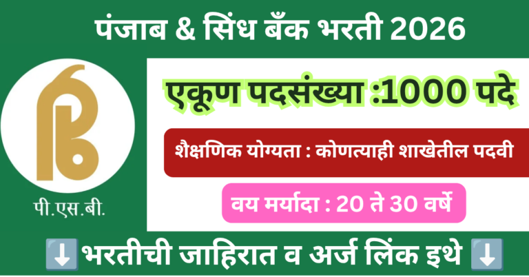 Read moreपंजाब & सिंध बँकेत 1000 पदांसाठी बंपर भरती 2026 | Punjab And Sind Bank Bharti 2026
