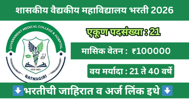 Read moreशासकीय वैद्यकीय महाविद्यालय मध्ये 21 पदांसाठी भरती 2026 | GMC Ratnagiri Bharti 2026