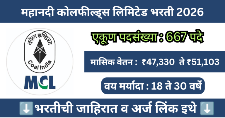 Read moreमहानदी कोलफील्ड्स लिमिटेड मध्ये 667 पदांसाठी बंपर भरती 2026 | MCL Bharti 2026