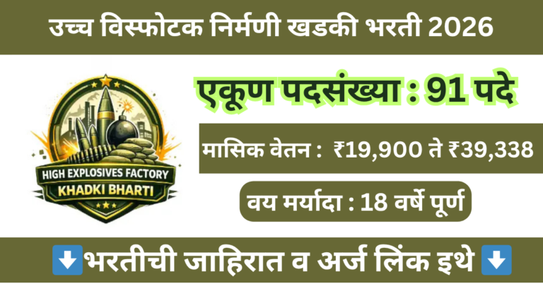Read moreउच्च विस्फोटक निर्मणी खडकी मध्ये 91 पदांसाठी भरती 2026 | High Explosives Factory Khadki Bharti 2026