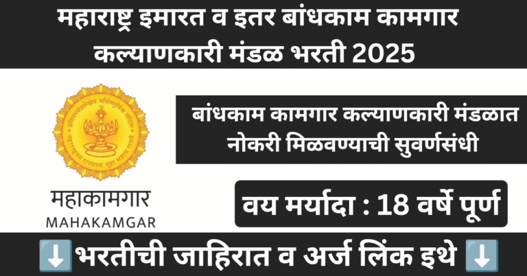Read moreमहाराष्ट्र इमारत व इतर बांधकाम कामगार कल्याणकारी मंडळ भरती 2025 | MAHA BOCW Mumbai Bharti 2025