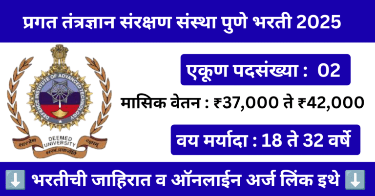 Read moreDIAT Pune Bharti 2025 : प्रगत तंत्रज्ञान संरक्षण संस्था पुणे भरती 2025, फक्त 02 जागांसाठी संधी, लगेच अर्ज करा