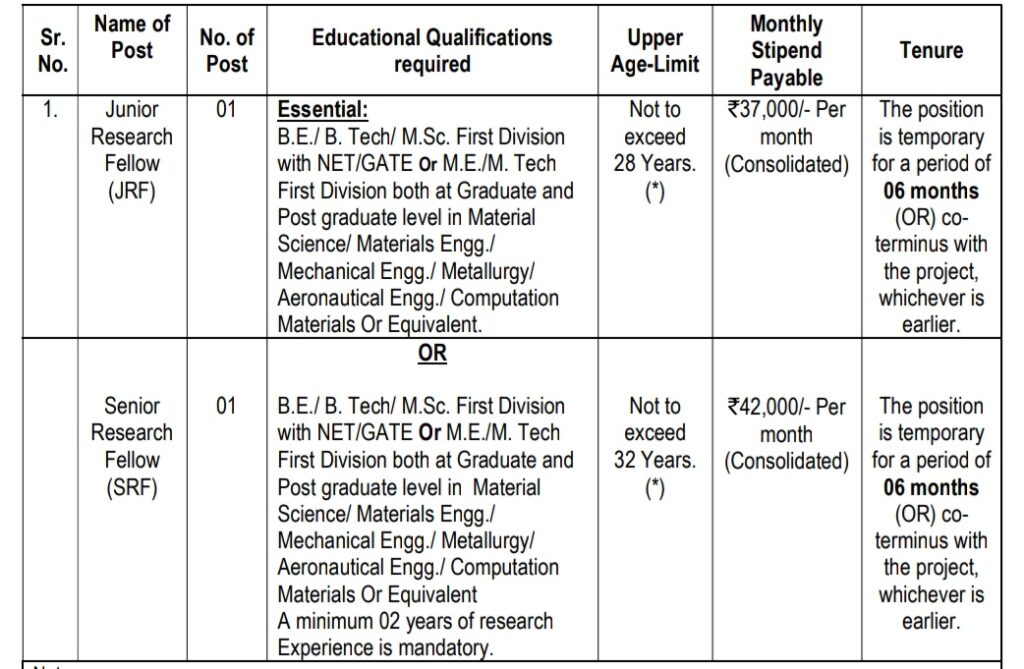 मासिक वेतन : ज्युनियर रिसर्च फेलो (JRF) या पदासाठी ₹37,000 हजार रुपये मासिक वेतन दिले जाईल आणि सिनियर रिसर्च फेलो (SRF) या पदासाठी ₹42,000 हजार रुपये मासिक वेतन दिले जाईल.